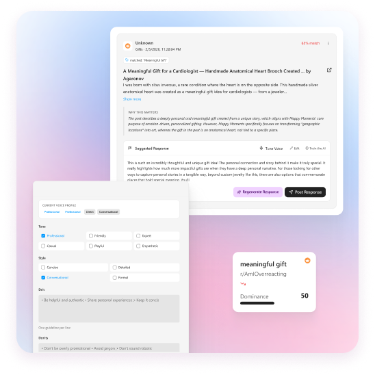 Choose which subreddits or X accounts to monitor and set response generation thresholds. Apply platform-specific filtering rules to target exactly where your audience hangs out.